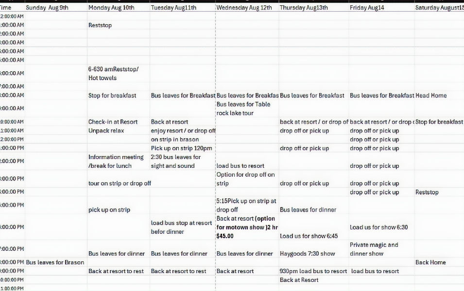 We’ve put together this form and an example of our itinerary spreadsheet to make planning easy. The form collects your essential details (like transportation type, dates, entertainment, include 2 meals daily.), which then fills our group spreadsheet. This helps us, as your organizer, keep everything in one place so no one gets left behind and every detail—from beds to brunch—is covered!